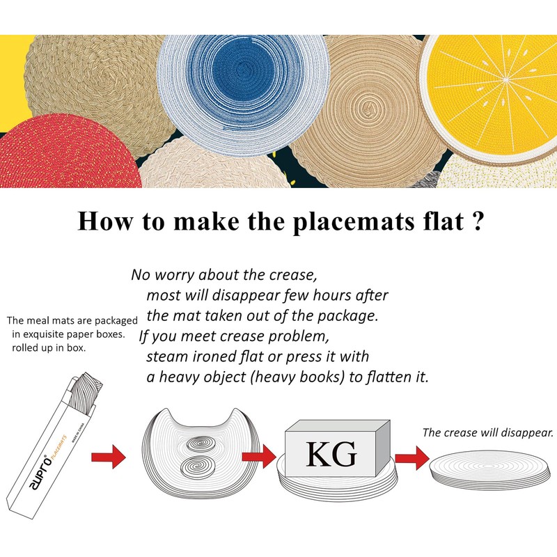- ✔Easy to clean:washable by hand,wipe clean with a sponge,if there's a stain on it,just clean it with soft fur brush.you can roll up to store away,placmats can be flatened when put out to use. not fade and shrink.