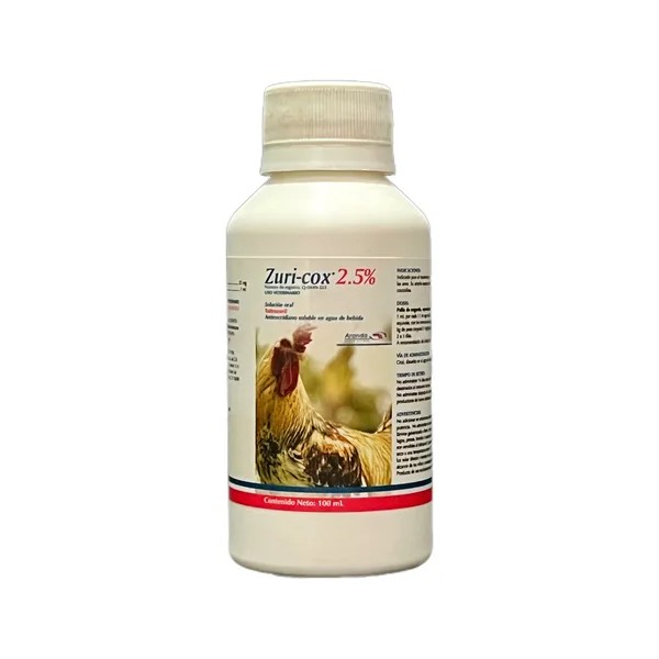 Zuri-Cox 2.5% de Aranda es un antiparasitario oral a base de toltrazuril, indicado para el tratamiento y control de la coccidiosis en aves. Su acción de amplio espectro combate eficazmente todas las especies de coccidias, ayudando a mantener a las aves sanas y con buen rendimiento.