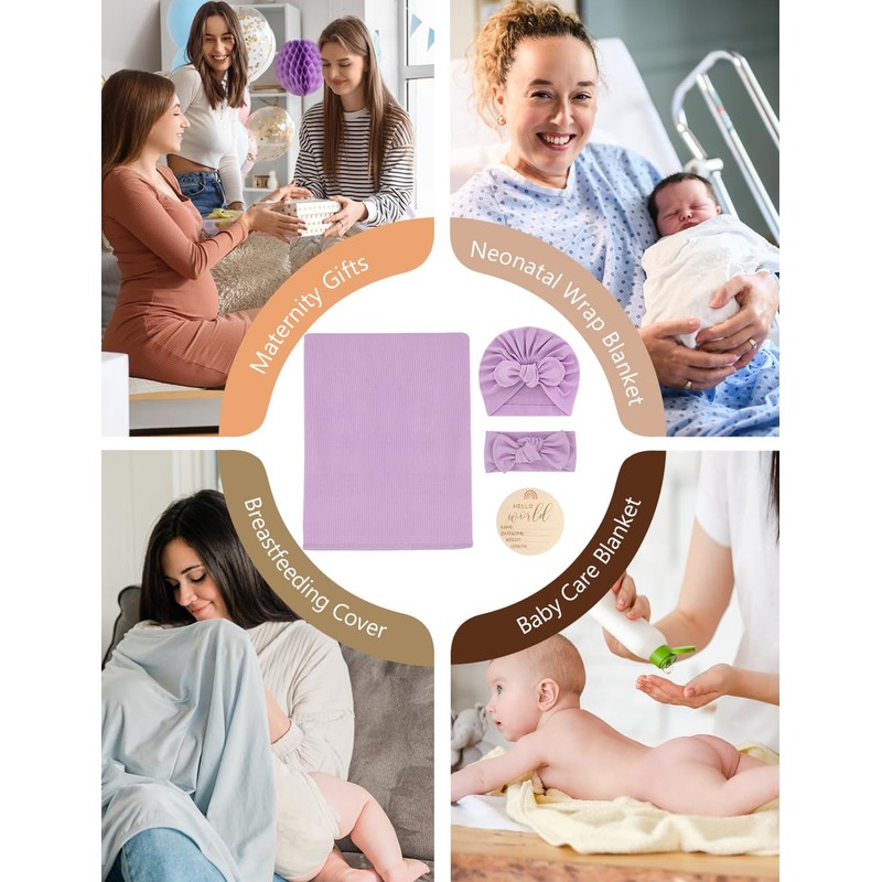 The newborn stretchy swaddle blankets headband bow set includes: 1pc blanket + 1pc baby hat with bows + 1pc baby headband+ 1pc Wooden Birth Announcement Card, it can be used as Swaddling Blanket, Nursing Stroller Cover, Burp Cloth, Car Seat Cover , Newborn Hospital Outfit or A Gift for Baby Shower.