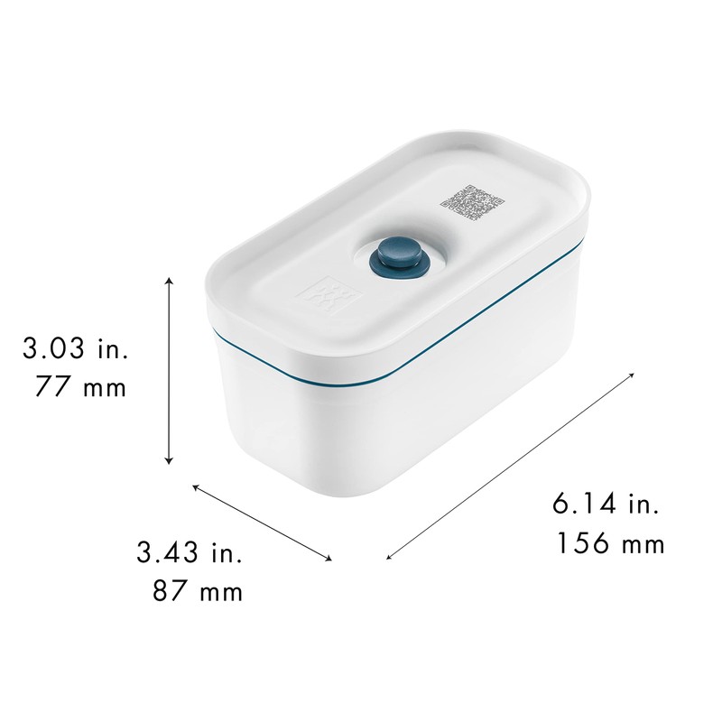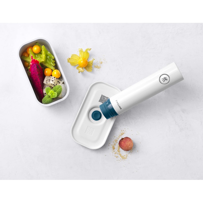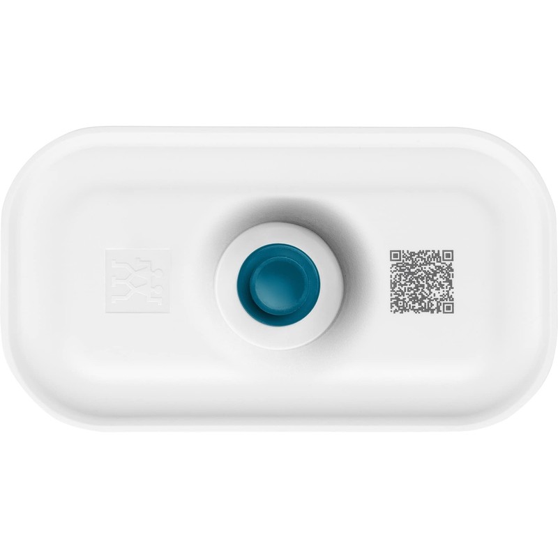 • Smart meal prepping: each organiser box has a QR code on its lid: thanks to the intelligent Zwilling app, the freshness status of all prepared food can be tracked via smartphone. Box contents: 1 x Zwilling vacuum lunch box plastic, size S (0.5 L, 16 x 9 x 8 cm), white La Mer, material: BPA-free plastic (lid and container), silicone (valve and seal), 1009484. A separately available ZWILLING Fresh & Save vacuum pump is required. This is not included.