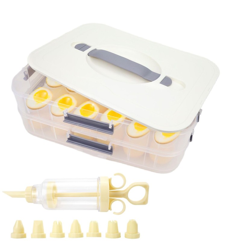 2-Layer Deviled Egg Containers With Lid,36PCS Deviled Egg Tray Carrier with Handl Injector Piping Tool,Portable Stackable Egg Holder Platter Holder Organizer for Refrigerator Party Picnic Travel Event