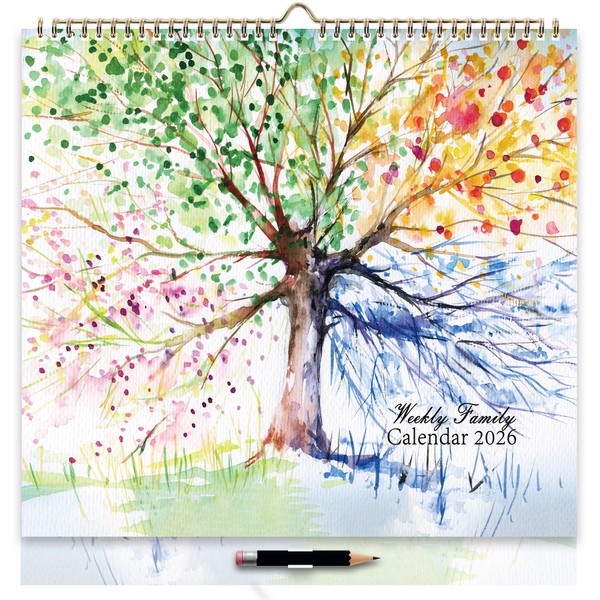 ZXHQ 2026 Family Calendar for UK, Jan–Dec, 6-Column Layout, 30.5 x 32cm, 52 Weeks One Week/Page, Wall Calendar & Family Planner with UK Holidays, Back Pocket, Four-Season Tree