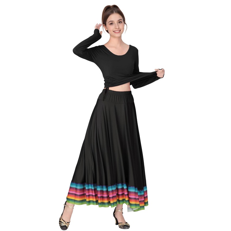 ZYACTU Women Ballroom Dance Skirt Swing High Waist Long Skirts Folkloric Mexican Flamenco Dance Skirt, 019-black, One Size
