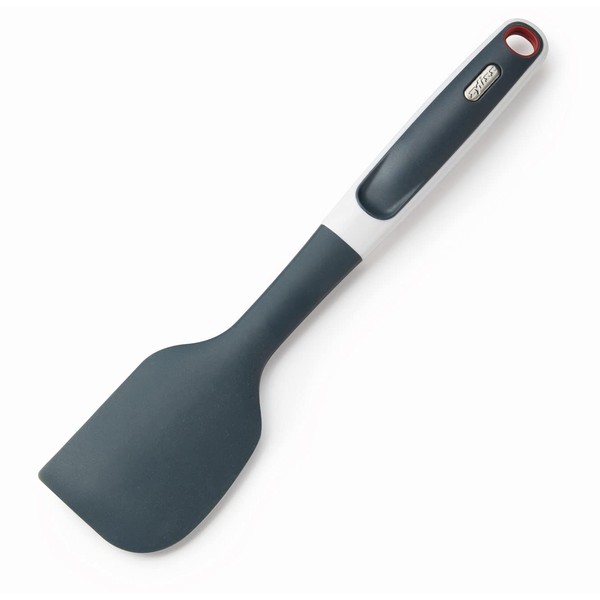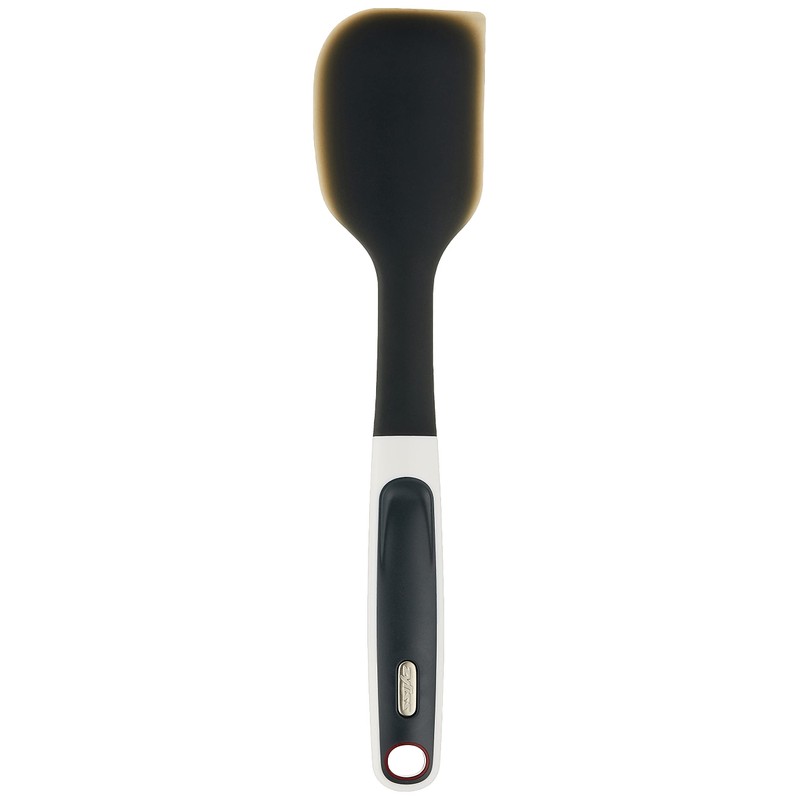 - Flexible silicone head designed for both scraping into difficult corners and along round edges of cookware