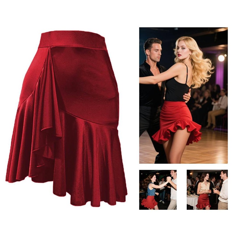 ZYMOZYM Women Black Asymmetrical Lotus Latin Dance Skirt with Underpants (US, Alpha, Small, Regular, Regular, Burgundy Red)