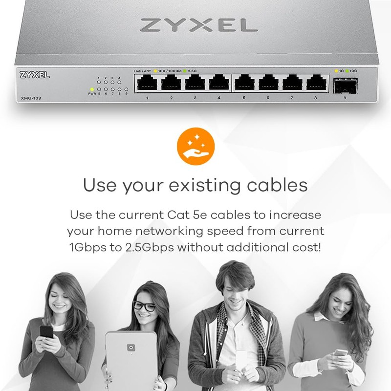 Zyxel 8-Port 2.5Gb MultiGig Ethernet Unmanaged Switch | 8 x 100/1G/2.5G Ports + 1 x 10G SFP+ | Plug & Play | Metal Housing | Desktop or Wall-Mount | Ethernet Splitter XMG-1058