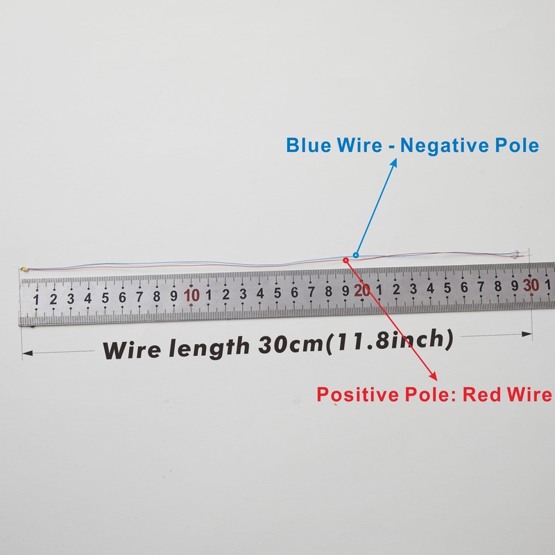 - Especificaciones: tamaño del LED: 0805 LED (0.08 × 0.05 × 0.3 pulgadas). 0.13 pulgadas. Cables aislados ultra delgados. Longitud de los cables de plomo: 30 cm. Polo positivo: cable rojo / polo negativo: cable azul