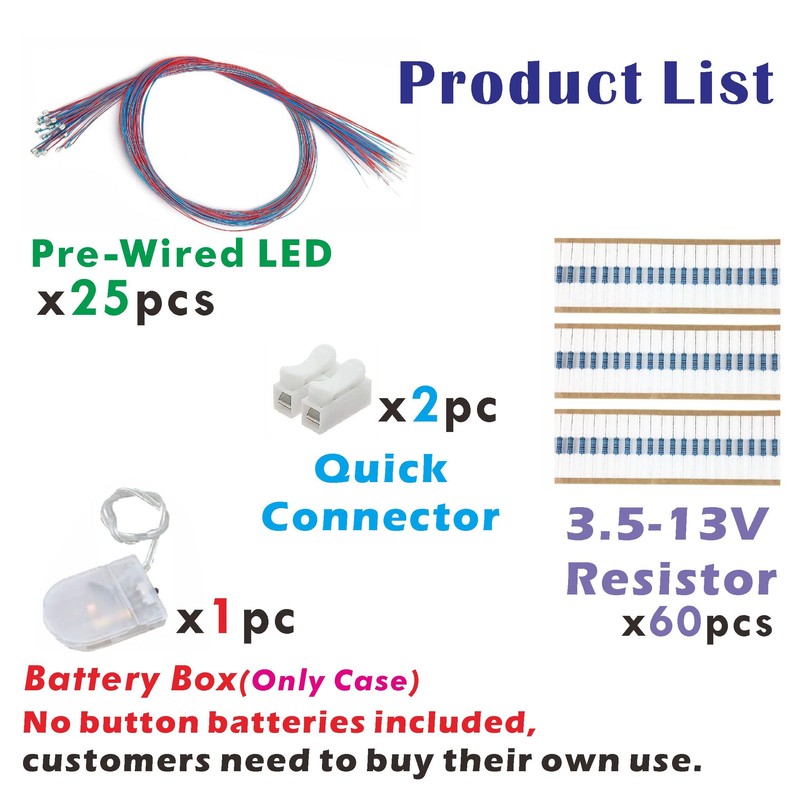 1. El paquete incluye LED SMD precableado + soporte de batería (con interruptor) + conector CH2, no hay necesidad de instalar resistencias puede iluminar rápidamente el LED, es muy adecuado para modeladores principiantes.