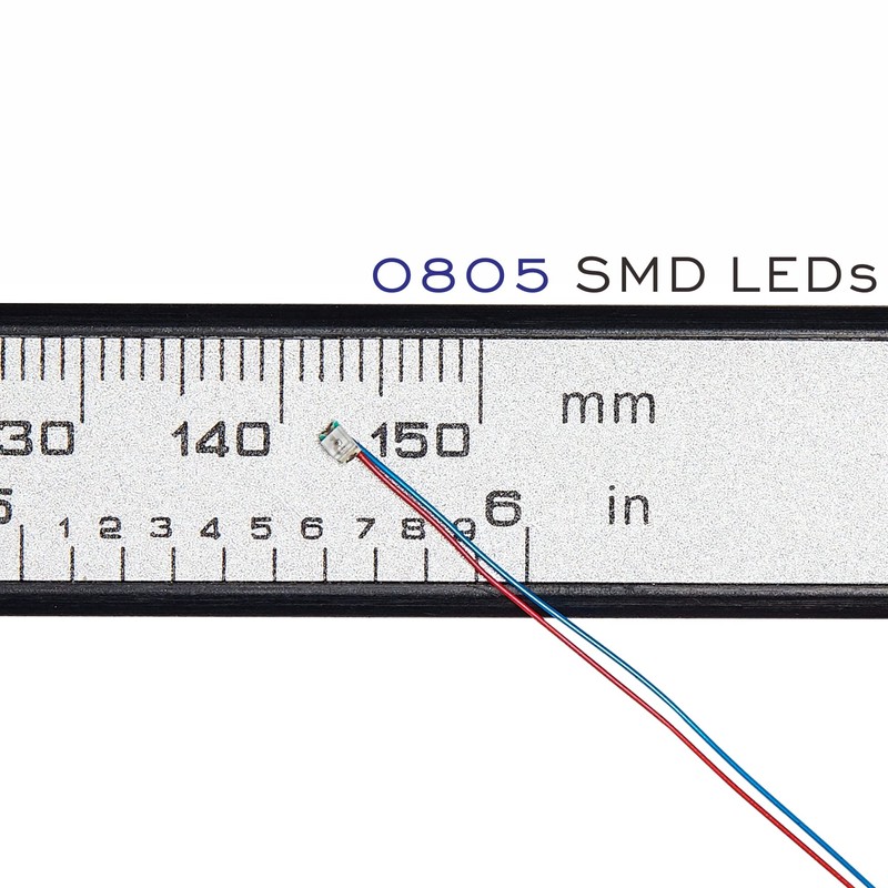 0805 LED (0.08 × 0.05 × 0.3 pulgadas). 0.13 pulgadas. Cables aislados ultrafinos / Longitud de los cables de plomo: 30 cm.