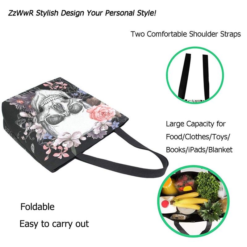 ZzWwR Skull and Flowers Day of The Dead Extra Large Canvas Market Beach Travel Reusable Grocery Shopping Tote Bag Portable Storage HandBags